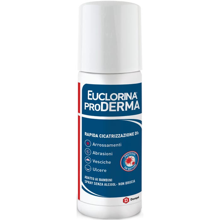Dispositivo medico in polvere spray che crea una barriera protettiva coadiuvante il trattamento di ferite, ulcere, abrasioni, ustioni minori, lesioni cutanee con essudato, eritemi da pannolino, macerazioni da sudore e lesioni traumatiche superficiali. Euclorina ProDerma Spray è indicato anche nella medicazione delle ferite post-chirurgiche e del moncone del cordone ombelicale. Il dispositivo medico forma una barriera filmogena protettiva contro le aggressioni microbiche, favorendo il ripristino delle normali condizioni fisiologiche per una rapida cicatrizzazione.